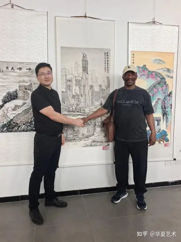 李树杰和津巴布韦共和国驻华大使馆经济公使 格拉西亚诺·尼亚古斯(Grasiano Nyaguse)在作品前合影留念