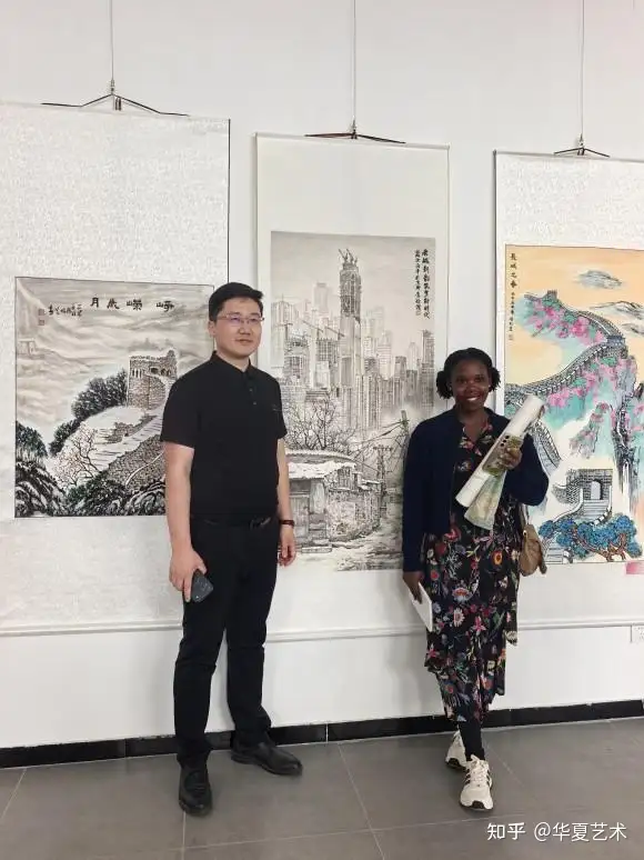 李树杰和津巴布韦共和国驻华使馆经济公使格拉西亚诺·尼亚古斯的夫人在作品前合影留念