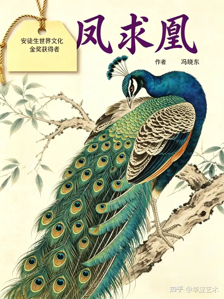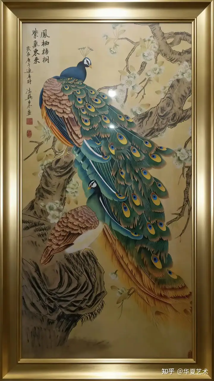 其创作核心意象的民间神话与文化溯源。凤栖梧桐:百鸟之王的择木之智。“凤栖梧桐”是中国流传千年的经典祥瑞典故,其文化根脉深植于上古神话与传统民俗:神话出处:《诗经·大雅·卷阿》有云:“凤凰鸣矣,于彼高冈。梧桐生矣,于彼朝阳。” 这是“凤栖梧桐”最早的文字记载,后世更衍生出“凤凰非梧桐不栖,非醴泉不饮,非竹实不食”的民间传说。在神话体系中,凤凰是百鸟之王,象征祥瑞、高贵与忠贞;梧桐则是“树中之王”,代表高洁、正直与祥瑞,是君子品格的化身。民间寓意:佳偶天成,姻缘圆满:画面中雌雄孔雀(凤凰的世俗化身)相依相伴,正是“凤栖梧桐”最动人的延伸——梧桐为家,凤凰为侣,象征着天作之合、良缘天成,是对美好爱情、幸福婚姻的极致礼赞。筑巢引凤,贤才汇聚:民间以“栽下梧桐树,引得凤凰来”为喻,象征着打造优良环境、招揽贤才,寓意事业兴旺、基业长青。高洁品格,祥瑞临门:凤凰择梧桐而栖,象征着君子择善而从、坚守本心,同时也寓意着祥瑞降临、家宅平安。
