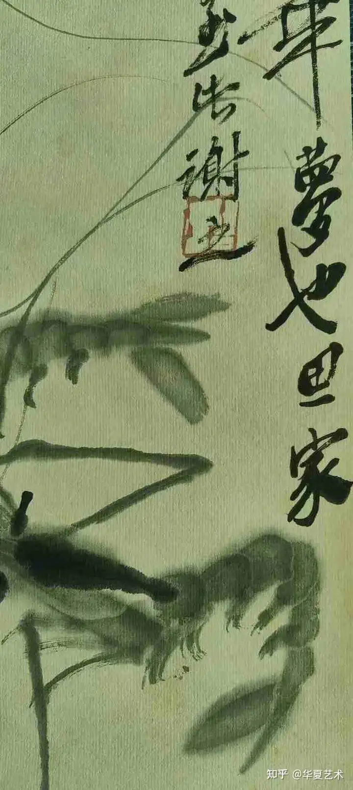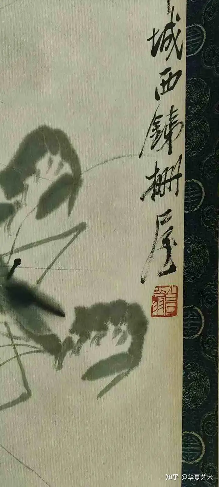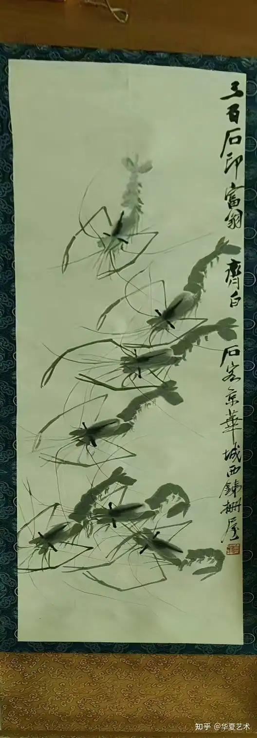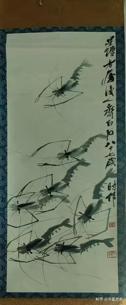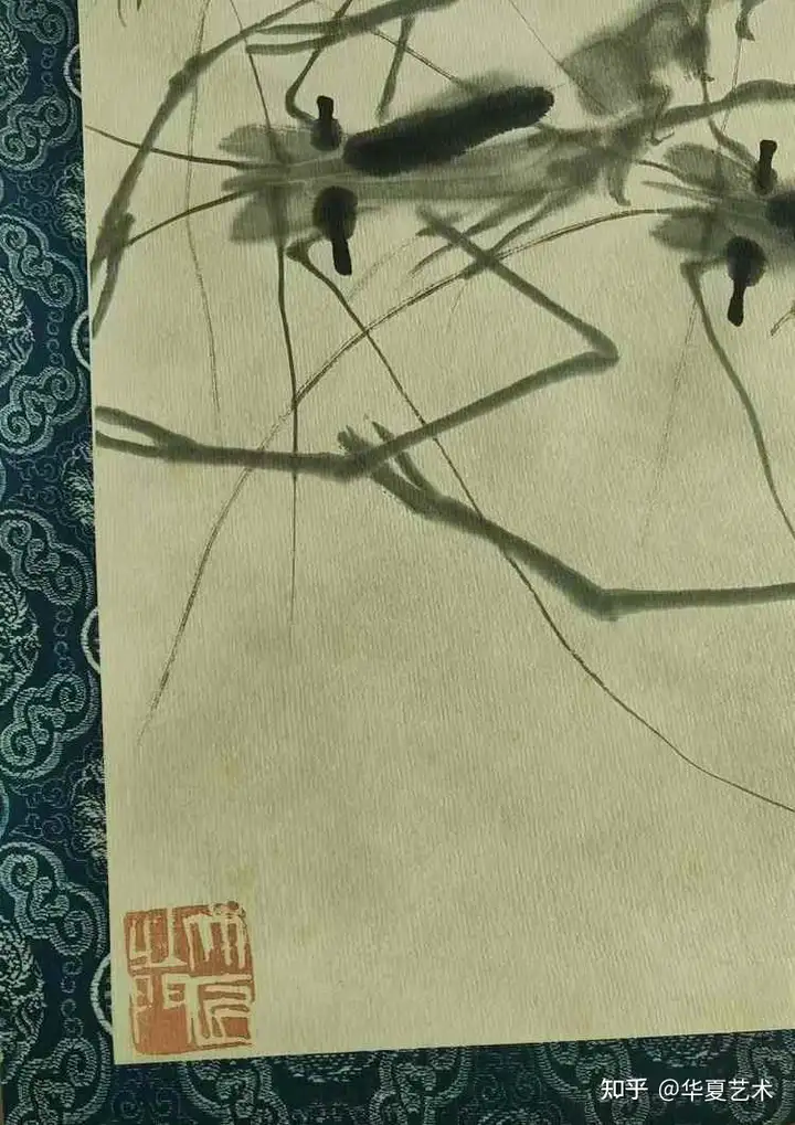 ◦ 构图:竖幅构图中,群虾错落排布,有聚有散,营造出水中群虾嬉戏的生动意境,留白处给人“水”的想象空间,达到“画中有水,无中生有”的效果。
