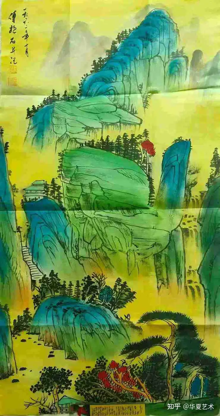• 色彩:以石青、石绿为主色,在黄色绢/纸底上层层晕染,色彩明艳厚重,极具视觉张力。