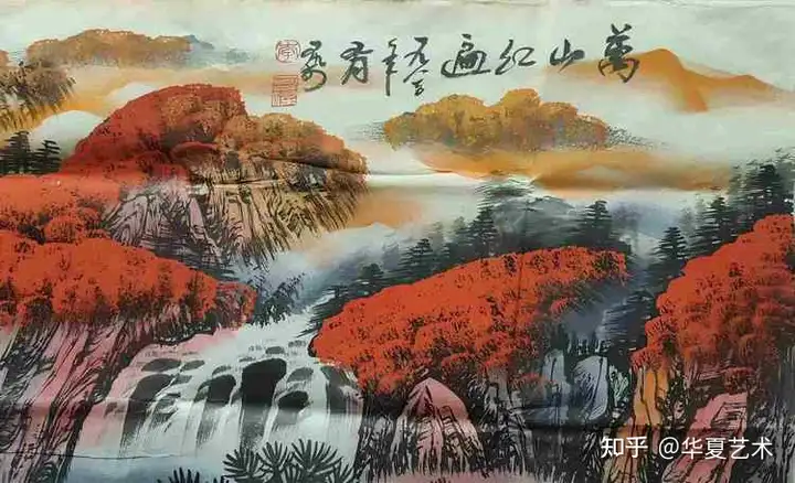 • 色彩:以大面积曙红等红色铺就山林,搭配墨色、青色、赭石,形成强烈的视觉冲击,既保留了传统笔墨的韵味,又有现代色彩的张力。