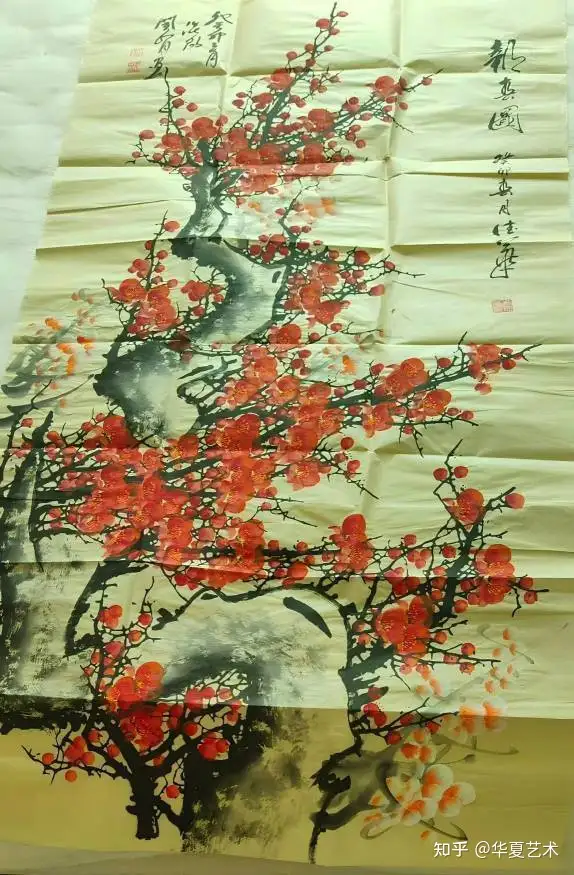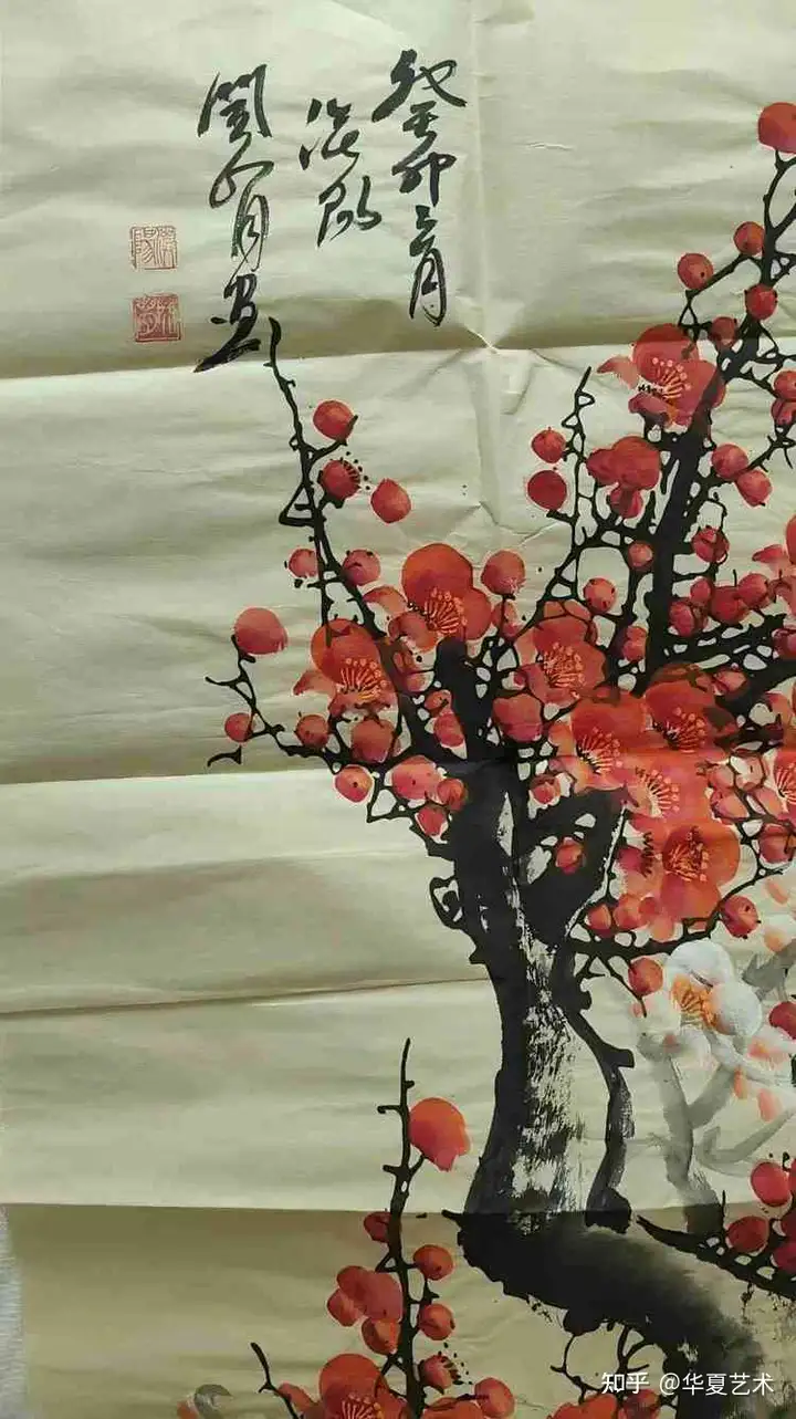 ◦ 花朵:以朱砂、曙红点染红梅,色彩浓艳饱满,花瓣层次分明,疏密错落,营造出繁花似锦的春日氛围。