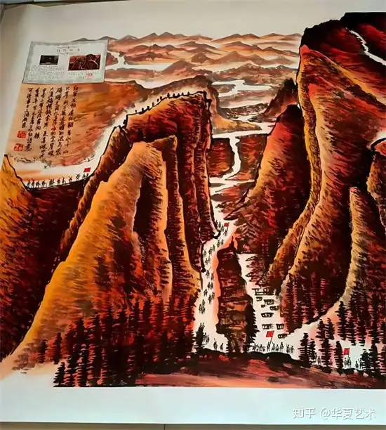 • 构图与意境:以近景的险峻山体、中景的行军队伍、远景的层叠山峦,营造出“雄关漫道”的壮阔意境,是典型的红色山水叙事结构。