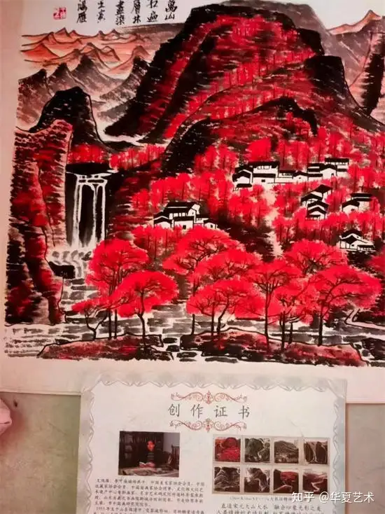 • 艺术技法:以积墨法+朱砂重彩为核心,用层层叠加的浓墨塑造山体厚重感,再以朱砂、朱膘等矿物颜料渲染枫林,营造出“漫山红透”的震撼视觉效果。