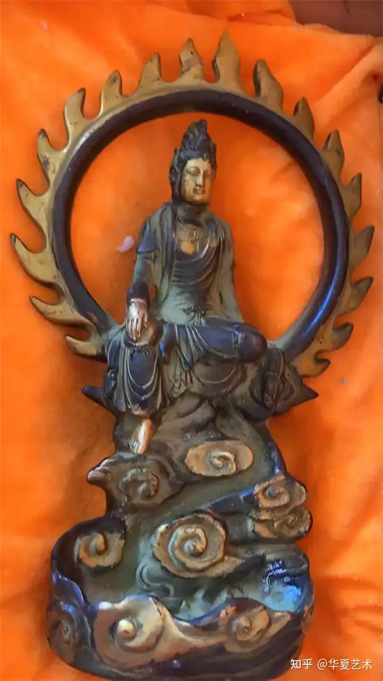 它一改传统佛像的端坐姿态,以“游戏坐”(半跏趺坐)呈现,左腿盘曲、右腿自然垂下,神态安然,象征“观世自在、慈悲普度”,传递出超脱世俗的禅意。背后的火焰纹背光与祥云底座,既强化了神圣庄严的氛围,也暗含着“佛光普照、祥云护佑”的吉祥寓意。
