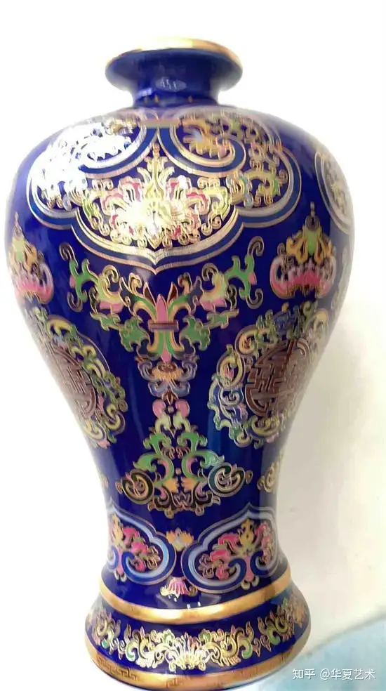 ◦ 瓶身以霁蓝釉为地,色泽深沉饱满,搭配粉彩、描金工艺,纹饰层次丰富、色彩浓艳华丽。