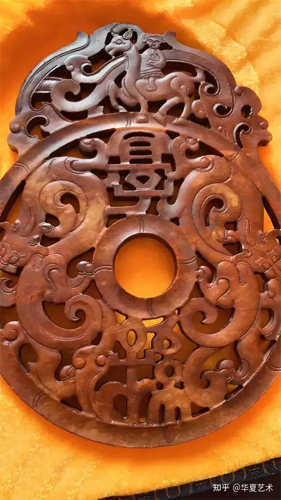 它采用透雕、浮雕结合的技法,主体为圆形玉璧,上方延伸出廓部分,如是汉代玉璧的创新形制。璧体中心为圆孔,象征“天圆”;透雕的螭龙与祥云纹线条流畅灵动,工艺精湛;璧身中央的“长乐”吉语铭文,经典元素,字体古朴苍劲。