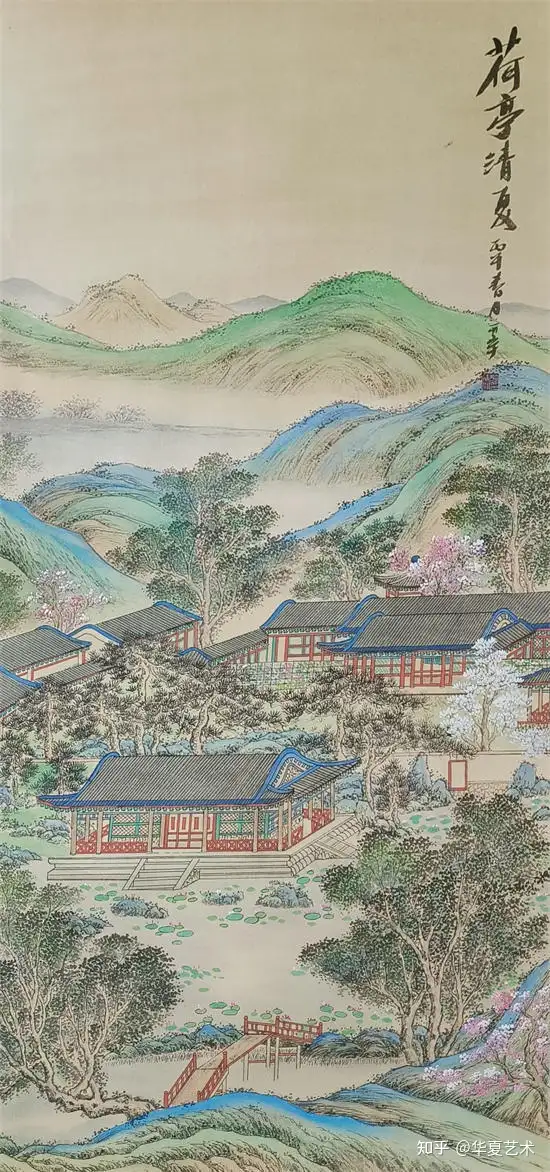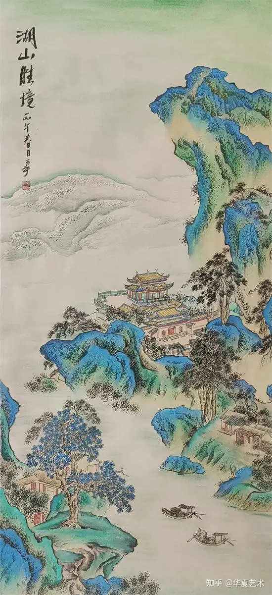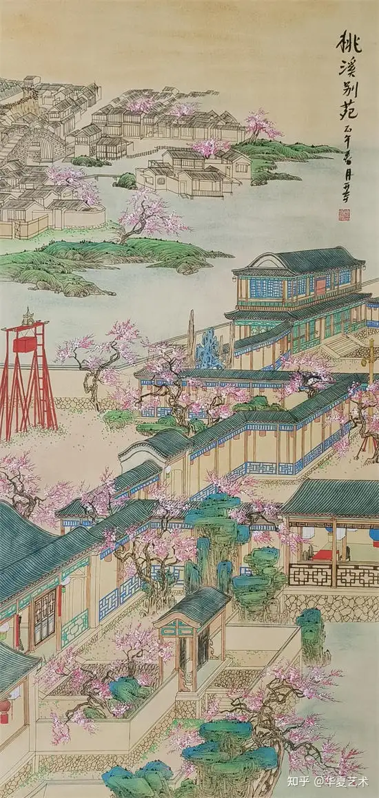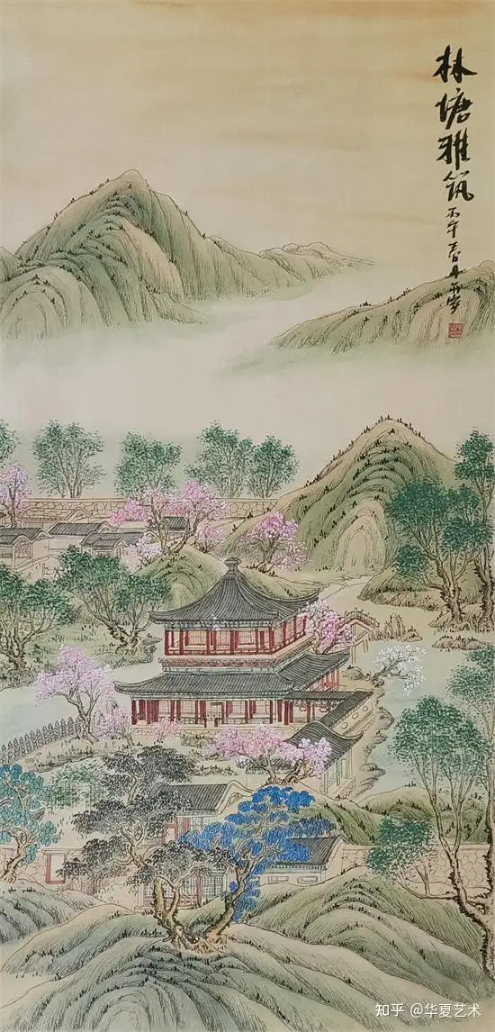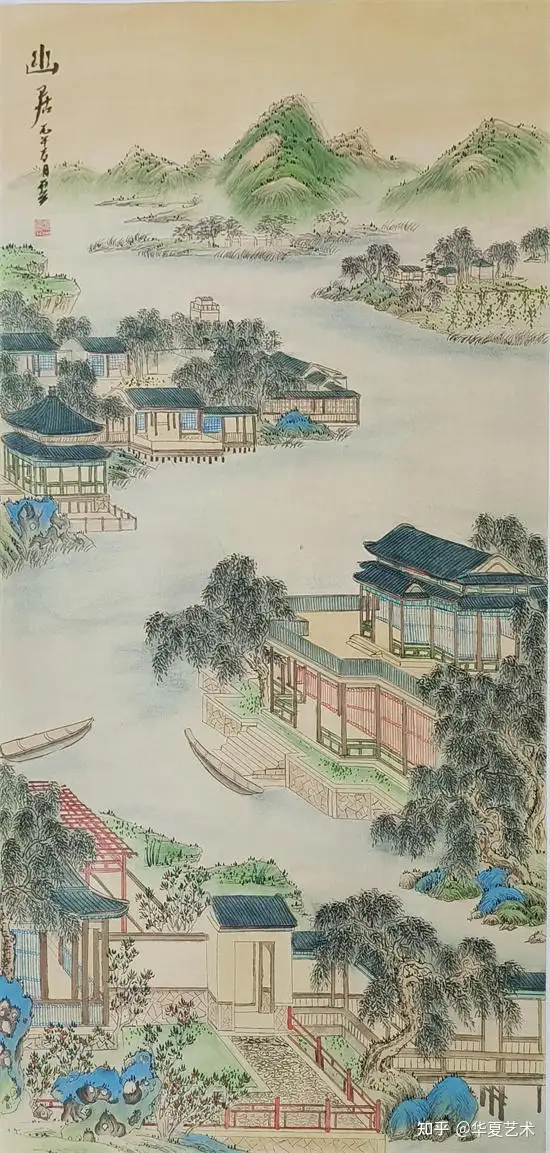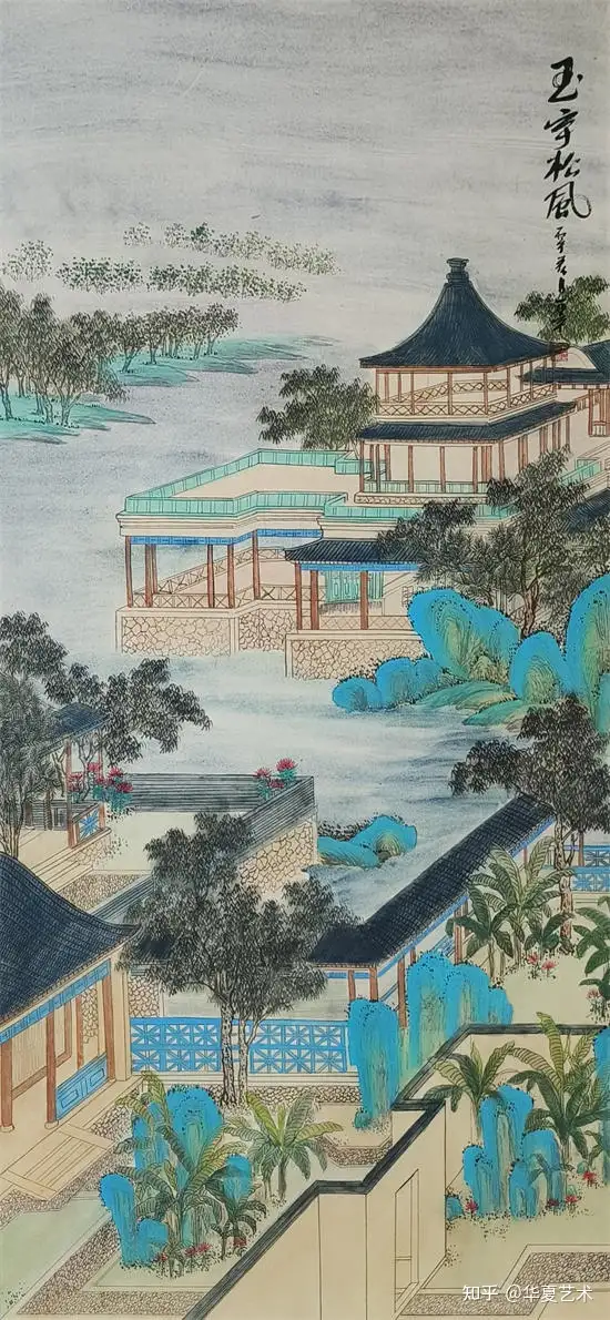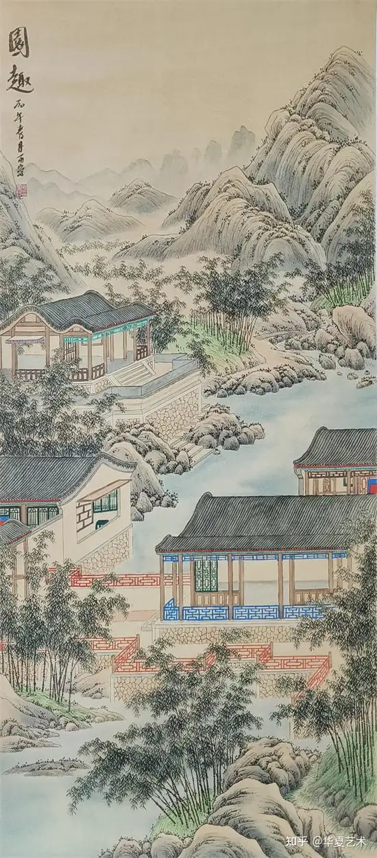 他绘的楼阁,工细谨严,古韵盎然,亭台错落,回廊婉转,一梁一柱皆合规制,一砖一瓦尽显匠心。线条细腻精准,设色清丽秀雅,松石环绕,云水相依,于工整中藏诗意,于静谧中见灵动,完美承袭古典界画的雅致精髓,格调高洁,意境清幽。
