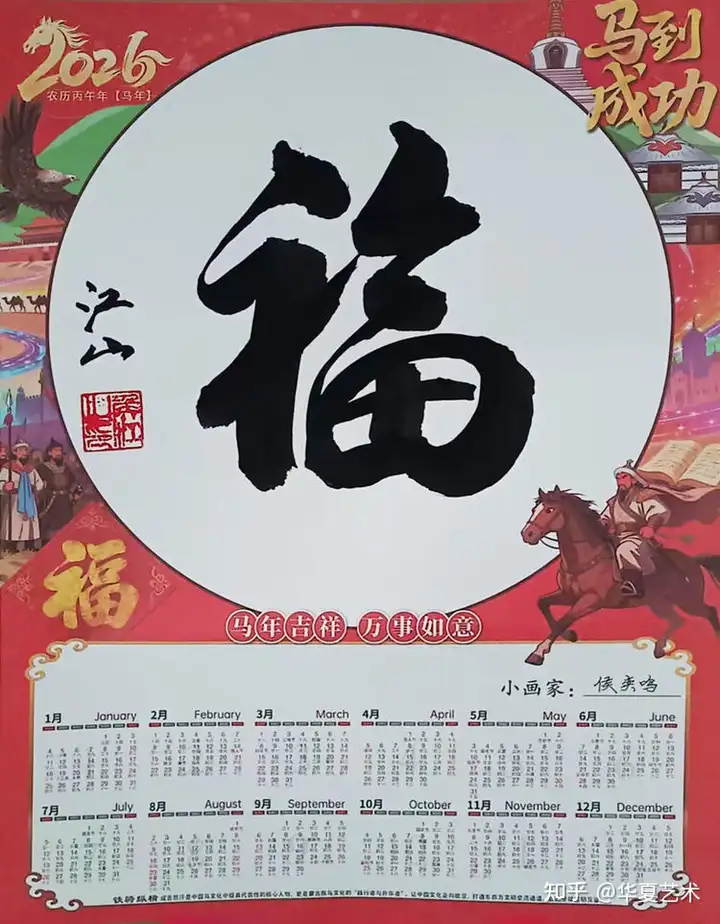 再看整体设计,2026马年“马到成功”的主题元素,与这幅福字浑然一体:奔马的昂扬姿态与书法的奔放笔势相互呼应,丝路风情的背景更添了几分开阔与厚重。“福”本是万家灯火的祈愿,这幅作品却写出了山河壮阔的格局,既有新春纳福的吉祥暖意,又有江山万里的豪情气象,字里行间满是龙马精神的蓬勃朝气,实在是一幅形神兼备、寓意绝佳的佳作!
