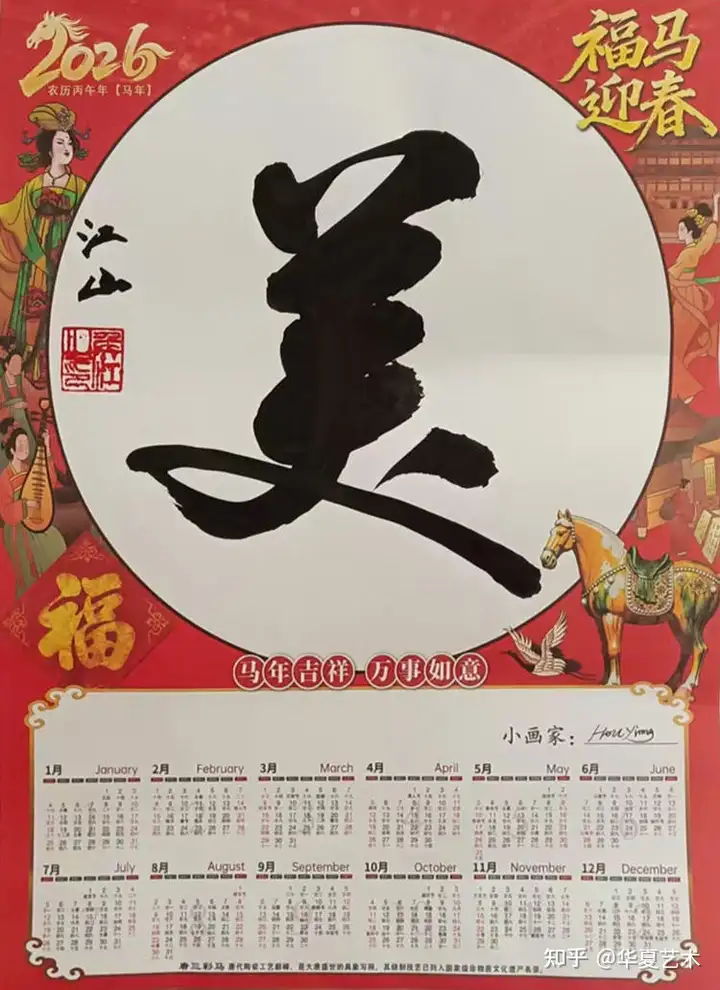 左侧题款“江山”二字与朱砂印章,与主字形成呼应,使整体构图疏密得当,虚实相生。背景的“福马迎春”主题元素、唐韵仕女与奔马,与书法的笔意浑然一体,奔马的昂扬姿态与“美”字的开张笔势相互映照,既烘托了新春吉庆的氛围,也暗合了“龙马精神”的蓬勃气象,章法布局浑然天成。