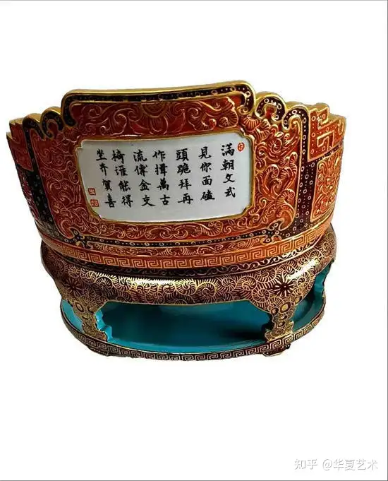 工艺表现:采用五彩描金技法,以浓艳的色彩绘制亭台楼阁、山水景观,搭配仿御玺式描金印章纹饰,整体风格华丽繁复。. 彩料与画工:真品的五彩发色沉稳,描金线条自然;